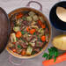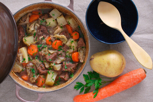 Mezcla bien, salpimenta y aromatiza con tomillo o mejorana, dejando que las verduras vayan tomando calor hasta empezar a ablandarse. Cubre con caldo, reincorpora el cordero y, si te apetece, añade un toque de salsa YR (muy irlandesa, parecida a la Perrins). Lleva a ebullición, tapa y mete al horno alrededor de una hora. Aprovecha ese tiempo para lavar, pelar y cortar las patatas en trozos de bocado. Pasado ese rato, incorpóralas a la cazuela, vuelve a meter al horno media hora y tendrás el irish stew listo.