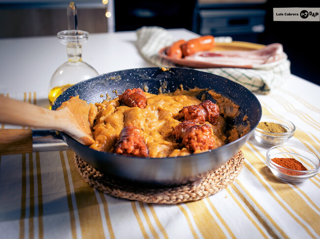 En una sartén grande calentamos dos o tres cucharadas de aceite de oliva, en las que vamos a freir la panceta cortada en tiras. Una vez que la panceta esté bien crujiente, la retiramos con ayuda de una espumadera y reservamos. En otra sartén cocinamos el chorizo o las carnes de nuestro gusto para acompañar las gachas –esto podemos hacerlo antes, después o mientras hacemos el resto de la receta–.