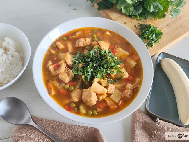 El mondongo se sirve siempre bien caliente, acompañado de arroz blanco, aguacate, un chorrito de limón, un poco más de cilantro picado por encima y plátano, del mismo que comemos como fruta, no el plátano macho. Es un plato casero, sabroso y de esos que se disfrutan sin prisa, con pan al lado y buena compañía.