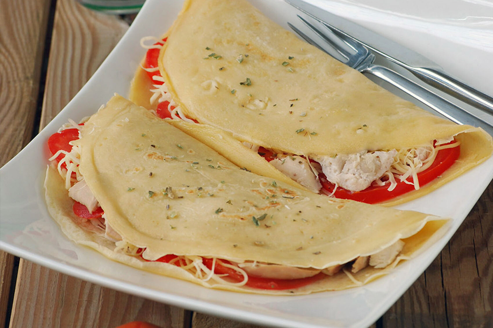 Calcula que para una crêpe normal necesitaremos un par de minutos por cada lado. Las vamos reservando y, ya fuera del fuego, montamos el relleno: un poco de pollo en cada una, queso rallado y, si queremos, un toque de sartén para que el queso se funda. Aun así, con el pollo templado (en el microondas o en otra sartén) suele bastar para que el queso empiece a deshacerse.