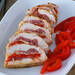 Esta pechuga de pollo rellena de jamón, pimiento y scamorza se puede acompañar de la guarnición que más nos guste para compartir entre dos; por ejemplo patatas asadas – aprovechando que tenemos el horno encendido -, verduras a la parrilla, arroz o cuscús, o una sencilla ensalada. A la hora de servir podemos añadir los jugos reservados para evitar que se seque demasiado, aunque si la tomamos recién hecha con el queso fundido resultará mucho más jugosa.