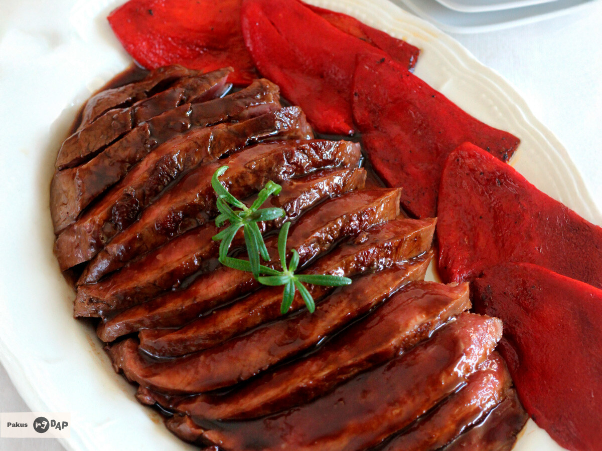 En una sartén, cocinamos los pimientos del piquillo dejandolos un par de minutos por cada lado y los rematamos añadiendo unos cristales de flor de sal. Fileteamos la carne y la servimos bañando las tajadas con unas cucharadas de la salsa de Pedro Ximénez.