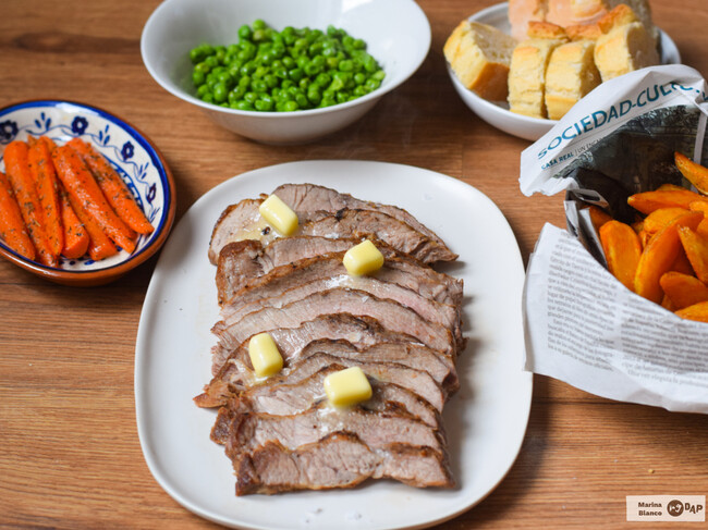 Una vez finalizada de cocción, pasamos la pieza a una tabla, cortamos en lonchas finas, y servimos con una guarnición que sea de nuestro gusto.