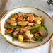 Familia Feliz es uno de esos platos que parecen un poco raros sobre el papel pero que luego funcionan sorprendentemente bien. Lleva pollo, ternera, langostinos y un buen puñado de verduras en un mismo salteado, así que al final tienes un plato muy completo, con contraste de sabores, texturas y colores.
