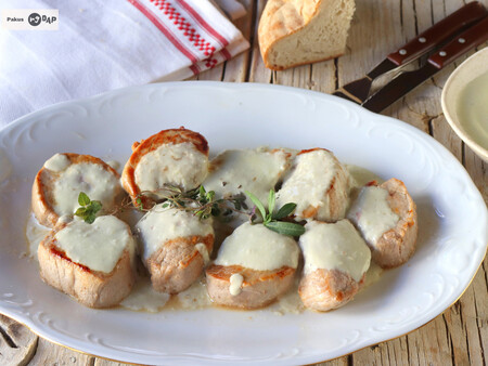Tras cinco minutos, trituramos la salsa con la batidora de mano. Colocamos los medallones de solomillo de cerdo en una fuente y cubrimos con la salsa de queso roquefort, disponiendo el resto en un cuenco para quien quiera servirse más. Servimos este plato muy caliente.