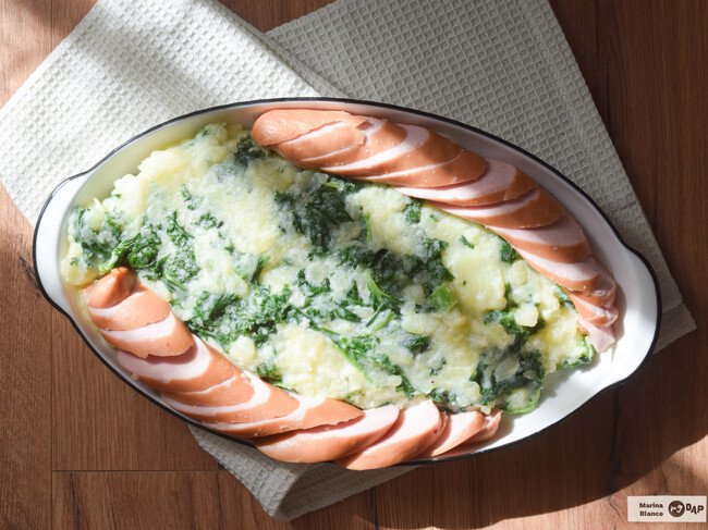 Servimos el puré en una fuente, añadimos las salchichas y servimos de inmediato.