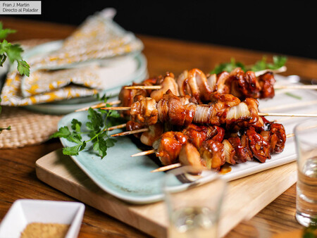 Un buen ejemplo, además barato, rápido y resultón, es este clásico yakitori de pollo. Al fin y al cabo, no deja de ser una brocheta muy sencilla en la que vamos a aprovechar un poco de salsa de soja, un poco de mirin, una cebolleta y una pechuga de pollo para resolver un segundo plato perfecto en cualquier momento del día, del mes o del año.