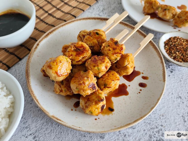 Las tsukune son unas albóndigas de pollo muy populares en los izakaya en Japón, donde se cocinan sobre parrillas tipo yakitori y se sirven en brocheta, bien doradas y recubiertas de una salsa brillante. Aun así, en casa se pueden preparar perfectamente en una sartén, sin complicación y con el mismo acabado jugoso y brillante.