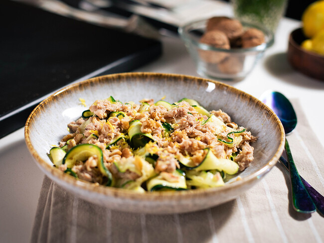 Ya solo queda servir y disfrutar a tope de este plato de calabacín y atún tan sencillo como delicioso. Lo puedes rematar con un poco de ralladura de limón y unas nueces picadas, pero esto es completamente opcional. Al gusto.