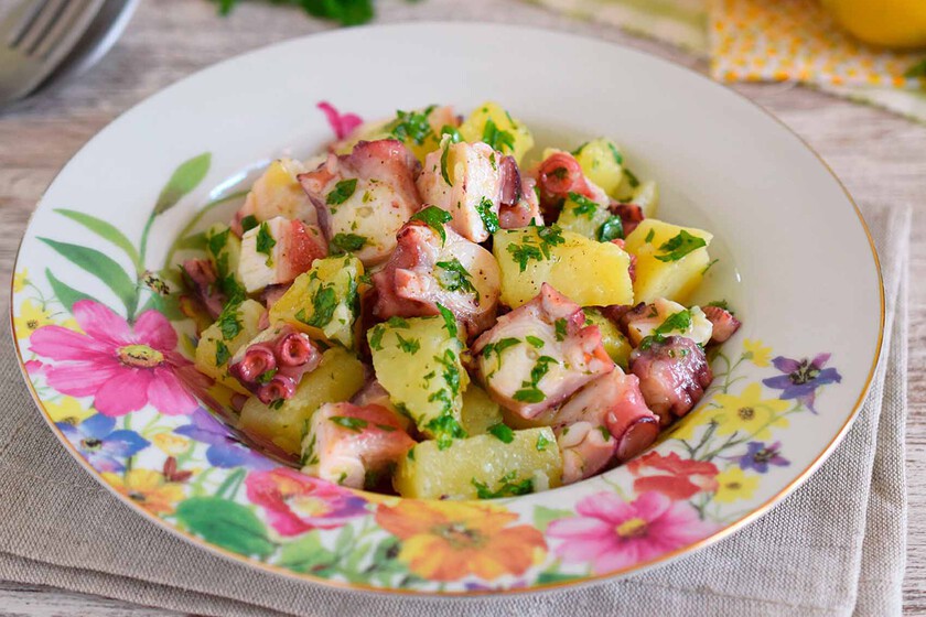 Puedes hacer la versión sencilla, que apenas es el pulpo y la patata, pero puedes enriquecerla con las hortalizas que quieras. Pimiento, cebolla, pepino, tomate… La base de la patata cocida y el pulpo lo admite casi todo.