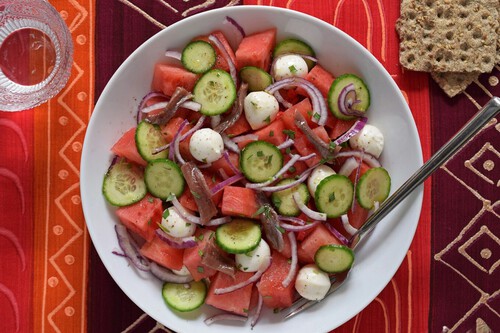 Me encanta la ensalada de sandía, mozzarella y anchoas porque el pepino termina por incorporar a la sandía lo que sí tiene el melón y ella no, un punto muy ligeramente amargo con una textura mucho más crujiente y fresca que realza el frescor más insípido de la fruta roja. Las anchoas son puro umami y ya por sí solas siempre es buena ida emparejarlas con queso; la mozzarella realza la sandía sin acaparar los sabores, pero puede sustituirse por un queso de cabra fresco o más suave, algún feta o similar.