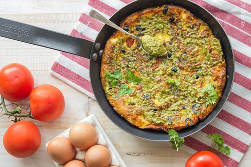 Porque para hacer una frittata o tortilla al horno estándar solemos cocinar primero los ingredientes del relleno antes de mezclarlos con los huevos batidos y llevar a una fuente a hornear. También en esta versión podemos empezar salteando los tomatitos o tomates troceados primero, pero podemos ahorrarnos ese paso y echarlos tal cual, en crudo.