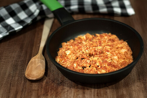 En una sartén, pongo un poco de aceite de oliva para dorar un par de dientes de ajo laminados, cuando están listos añado unas lonchas de jamón serrano y, cuando están algo crujientes, echo tres o cuatro cucharadas de tomate frito –suelo tener casero siempre en casa, pero uno de bote bueno funciona–. Una vez está el tomate caliente, es hora de hacer el revuelto propiamente dicho: bajo el fuego y echo el huevo batido, removiendo sin parar hasta tener un revuelto bien jugoso.