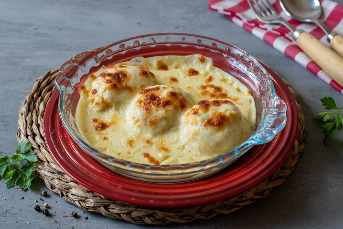 La elaboración clásica consiste en cocer huevos duros, hacer una farsa con verduras, bacalao y las yemas, y una salsa bechamel, de la que se toman un par de cucharadas para enriquecer ese relleno y dejarlo bien cremoso. Ya solo queda el montaje: rellenar las medias claras cocidas, ponerlas en una fuente, cubrir con el resto de la bechamel, y a gratinar al horno. Se puede dejar listo con antelación para simplemente hornear en el último momento.