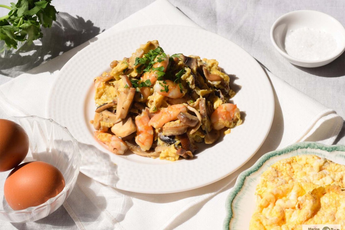 Ciencia, ninguna, como podéis interpretar. Solo hay que saltear brevemente las gambas troceadas y, tras reservarlas y en la misma sartén, añadir un poco de aceite, añadir los huevos batidos, procurando que queden cremosos. Algo a lo que podéis contribuir con una pizca de nata o una pizca de mantequilla.