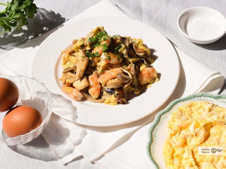 Cuando los huevos estén en su punto, reintegramos las gambas, dejamos que se mezclen ligeramente un par de minutos, a un fuego suave, para que los huevos no queden secos, y ya solo tendremos que emplatar para triunfar.