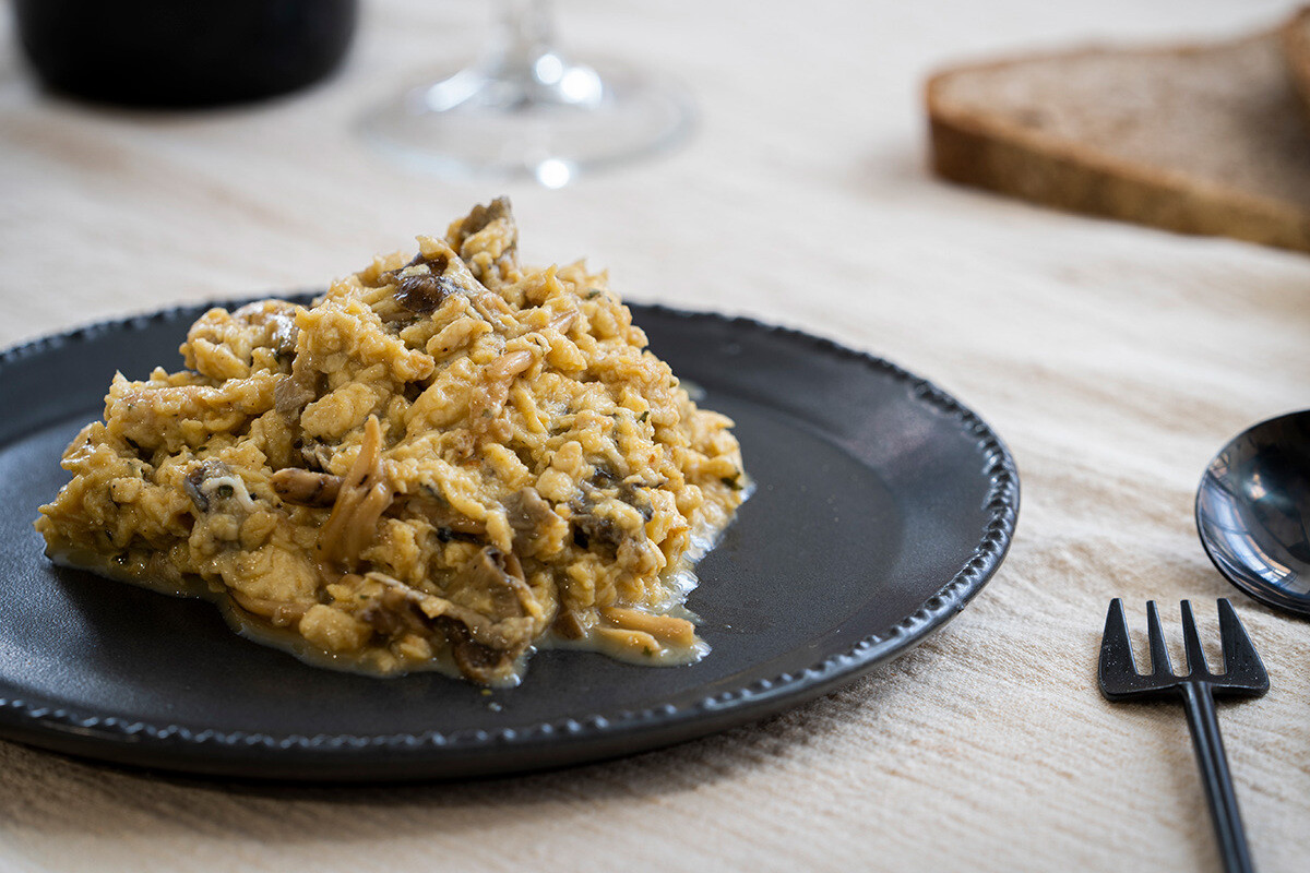 Igual que hacemos con la tortilla de patatas, en el revuelto de setas es recomendable que, una vez hayamos salteado a fuego fuerte las setas y hayan perdido el agua, las incorporemos al bol donde hayamos batido los huevos. Esta transmisión de temperatura va a permitir que el huevo empiece a cocinarse, quede jugoso y luego apenas tengamos que rematar el revuelto en la sartén.