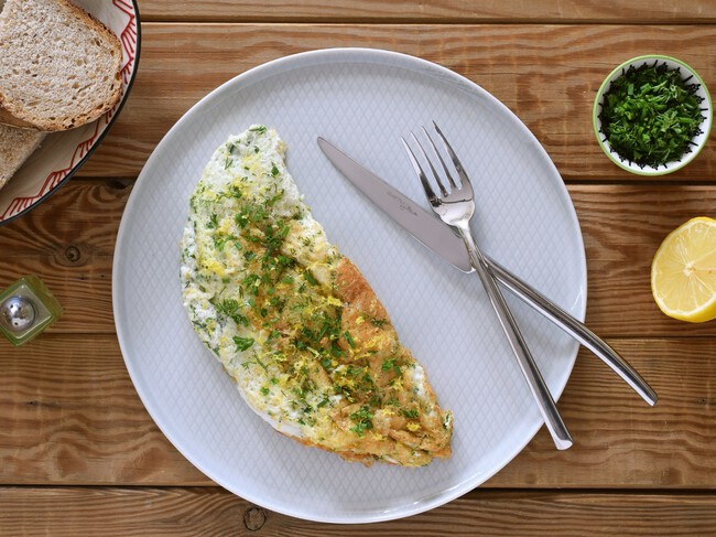 Si tienes una buena sartén de hierro, es el momento de usarla. La clave está en batir las claras hasta dejarlas muy esponjosas, sin montarlas, y calentar mucho la sartén sin engrasar. En el momento de cocinar, se engrasa ligeramente -echando aceite o mantequilla, o usando un pincel, pulverizador o papel de cocina, según quieras controlar la grasa- y se echa la mezcla de claras esponjosas con las finas hierbas deseadas.