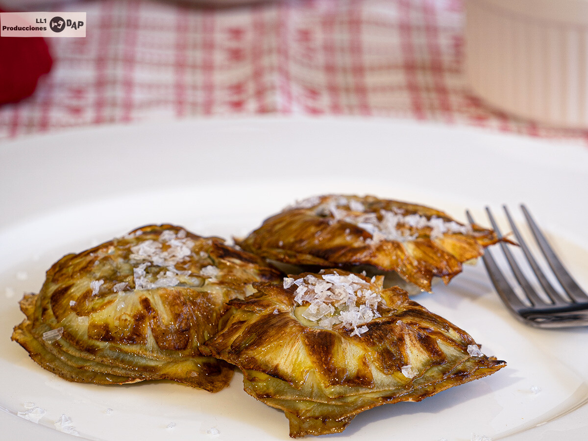 Cuando estén cocidas, las sacamos y escurrimos bien, evitando llevar agua a la plancha. Abrimos los pétalos para que la alcachofa quede bien abierta y plana.