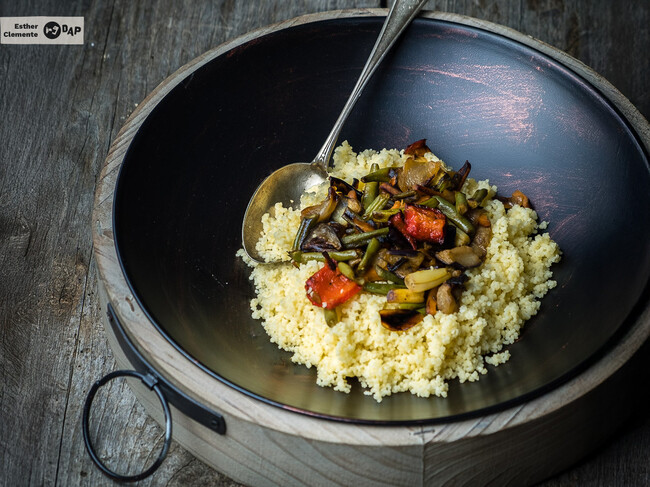 La facilidad con la que se prepara este cuscús es lo que hace que sea un plato perfecto para cuando hay prisa y queremos una comida rápida y sabrosa. Podemos añadirle multitud de ingredientes y es un "fondo de despensa" ideal tanto para salir del paso con el menú del mediodía o de la noche. Es muy similar al tajine de verduras al ras el hanout, y nos lleva también a la cocina marroquí. También nos gusta mucho preparar el cuscús con otros sabores como una ensalada templada al curry, aunque a veces lo sustituimos por el "falso" cuscús de coliflor. Y otro clásico, salvo que seas vegetariano, es combinar cuscús con pollo.