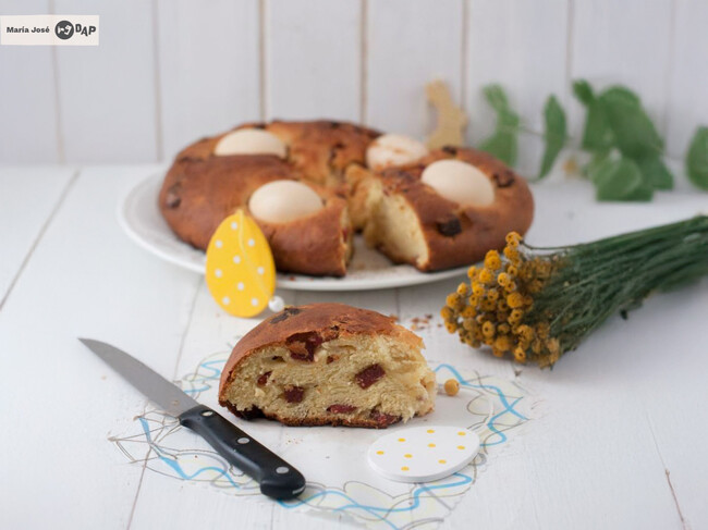 Sacamos la masa del bol y formamos con ella un anillo. Lo colocamos en una bandeja de horno previamente engrasada. Repartimos sobre ella los huevos, que previamente habremos limpiado con agua y jabón. Cocemos a horno precalentado a 180ºC unos 30 o 40 minutos. Dejar enfriar antes de servir.