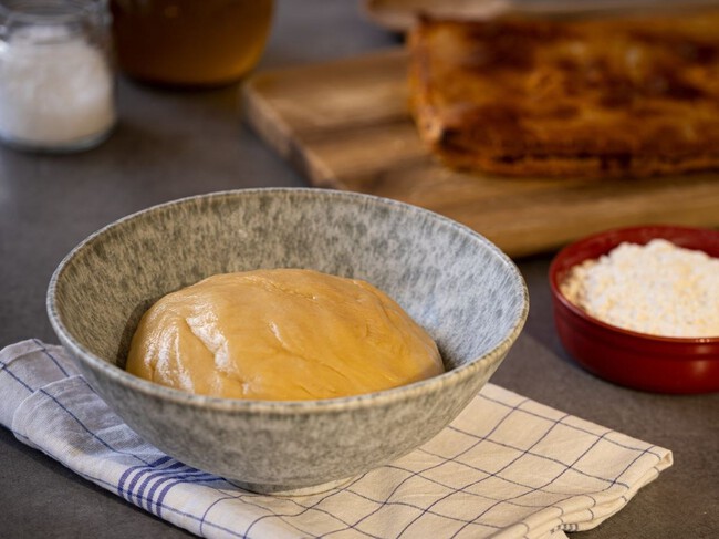 Meter en el vaso 415 g de harina con 10 g de sal. Fundir 45 g de manteca de cerdo con 140 ml de aceite de oliva y empezar a amasar. Verter 160 ml de agua y seguido el aceite más la manteca a Velocidad 3 durante 2 minutos.