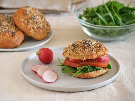 La masa es muy rica en proteínas y fibra ya que no lleva trigo, solo harina de avena y yogur natural, además de claras de huevo y semillas al gusto. Recomiendo utilizar yogur skyr natural, más espeso que el corriente de supermercado, o un griego con 5% de materia grasa, con el líquido bien escurrido. Salen con una miga tierna y esponjosa de sabor neutro, que personalmente me gusta también tostar una vez abiertos por la mitad, según con qué los vaya a rellenar.