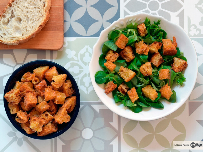 Coincidimos con este alegato del portal estadounidense Epicurious en el que la autora defiende los croutons de pan de hogaza frito en aceite de oliva, una verdadera delicia que, admitimos, es más calórica de lo que nos gustaría. Pero para tomar ocasionalmente, y en pequeñas cantidades -se trata de aderezar, no de comerlos como pipas-, no podemos más que recomendar.