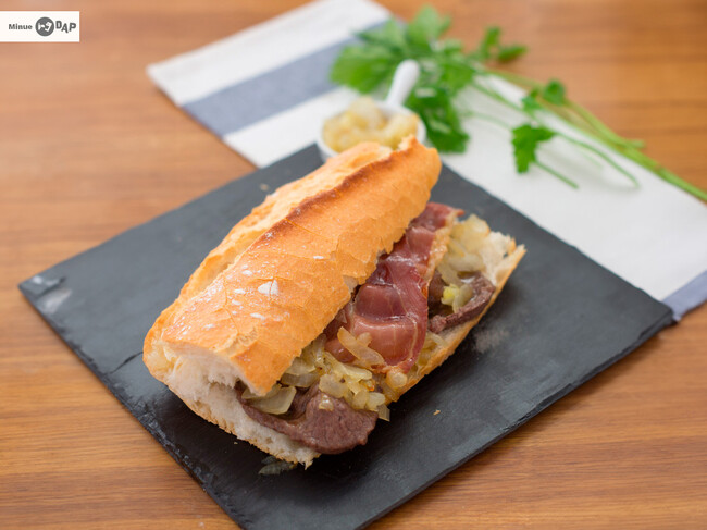 Hablo, claro, de la brascada, un riquísimo bocadillo formado por cebolla, filete de ternera y jamón serrano, todo cocinado en la misma sartén. La combinación es infalible.