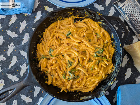 En una sartén, mezcla dos cucharadas de esta salsa con un paquete de queso crema, calienta y mezcla el conjunto mientras cocinas cualquier pasta corta de tu elección –los de la foto son unos deliciosos trofie que me traje de Cerdeña–.
