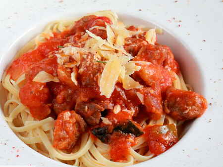 Es verdad que tiene algún matiz distinto respecto a la clásica boloñesa: aquí podemos usar vino blanco y añadimos unos pocos guisantes. Pero la diferencia más importante entre las carcamusas y una boloñesa —además del origen y el tiempo de cocción— es que las carcamusas se suelen hacer con magro de cerdo, cortado en taquitos finos, mientras que la boloñesa se prepara, evidentemente, con carne picada.