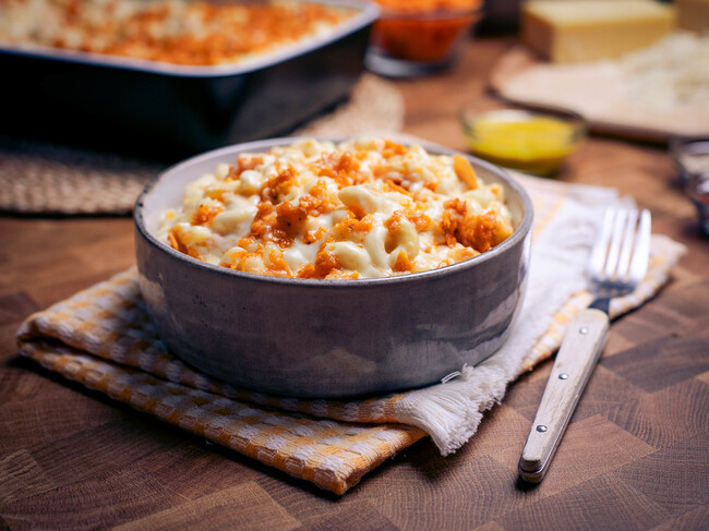 Esta versión de los mac and cheese comienza con una bechamel enriquecida con gouda y emmental, y con el toque sorpresa de una cucharadita de mostaza. A esta base incorporamos los macarrones –que en EEUU son más parecidos a lo que nosotros llamaríamos 'coditos– , para acabar con una mezcla de Risketos y Doritos machacados, queso cheddar, parmesano rallado, pimentón dulce y mantequilla fundida que, al gratinarse en el horno, nos deja una superficie dorada y crujiente sobre una pasta untuosa y deliciosa.