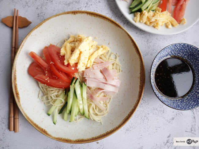 Es muy típico del verano en Japón y aparece en muchos restaurantes solo durante esa temporada. A diferencia del ramen caliente, este plato no lleva caldo hirviendo ni toppings grasos. Aquí todo va frío o a temperatura ambiente: fideos bien frescos, una salsa ligera y toppings muy finos como tortilla, pepino, jamón, tomate... Aunque cada casa lo hace a su manera.