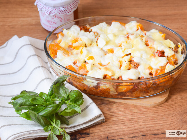 Los rigatoni al forno son un clásico de la cocina italiana que combina pasta al dente con una sabrosa salsa de tomate, carne picada y una variedad de quesos fundidos. Nosotros, además, hemos añadido chorizo, porque le va que ni pintado.