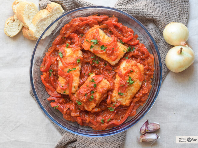 Una de las claves de su éxito está en la cocción del pescado, que previamente enharinamos y freímos un par de minutos en aceite bien caliente. Después, preparamos una buena base de sofrito, hecho con cebolla pochada con calma, pimientos rojos en tiras finas, y tomate.