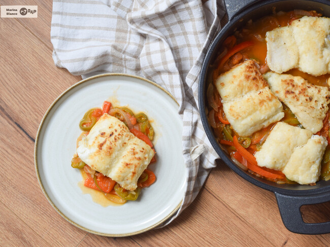 La preparación parte de un sofrito de cebolla, pimiento y tomate cocinado a fuego lento, al que se incorpora vino blanco para aportar profundidad. El bacalao, con un punto de cocción, se añade al final para que quede jugoso y se integre con la salsa.