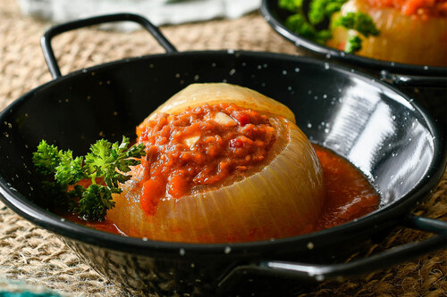 La clave está en partir de cebollas dulces y hermosas. Se pelan, se les corta la base y se vacían con un sacabolas, dejando un par de capas de grosor para que aguanten el guiso. Después, se ablandan en el microondas un par de minutos y se prepara la farsa: se pican los trozos de cebolla extraídos, se ralla un diente de ajo y se pocha todo unos diez minutos, hasta perder el sabor a crudo.