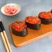 Cuando tengas las bases montadas, escurre y reparte por encima las huevas de salmón aliñadas. Hazlo con cuidado para que queden bien colocadas y llenen la parte superior del gunkan. La idea es que el topping quede abundante, bien visible y recogido dentro de esa pared de nori.