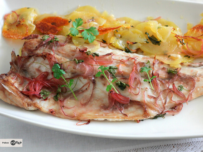 Cuando esté, sacamos el pescado del horno, separamos los lomos y los servimos con la guarnición de patatas a un lado. La explosión de sabor en cada bocado está garantizada. El pescado queda sabroso, lleno de matices sutiles, muy agradables.