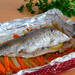 Precalentar el horno a 180ºC y preparar una bandeja o fuente grande. Seleccionar además una gran porción de papel de aluminio, suficiente para envolver por completo el pescado y poder retorcer los bordes.