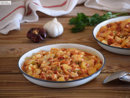 Su base es un sofrito de pimiento verde, pimiento cebollero y cebolla, pero que admite múltiples cambios. Yo, por ejemplo, lo preparé esta semana con medio bote de tomate triturado que andaba pidiendo salida en la nevera, pimiento verde, cebolla y pimientos del piquillo, que le dieron el sabor más dulzón y ahumado del pimiento choricero que justo no tenía en casa. Hay quien también añade patata, pero no es necesario.