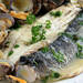 Una vez tengamos todo listo, colocamos sobre una fuente de horno los lomos del pescado y, si las vamos a utilizar, también las almejas, junto con un manojo de perejil picado, un poco del caldo de pescado que hemos preparado antes y la sidra.