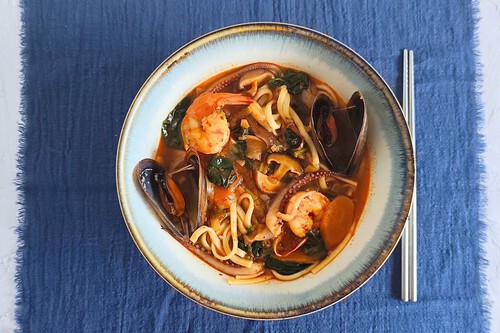 El jjampong (짬뽕) es una sopa coreana picante con marisco y fideos, muy típica de la cocina chinocoreana. Es un plato potente, con un caldo rojo lleno de sabor y ese punto picante que lo hace tan reconocible.