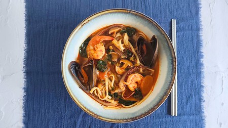 Es uno de los grandes platos de la cocina chino-coreana. Un caldo rojo intenso, fideos, marisco y el gochugaru justo para que se note sin pasarse