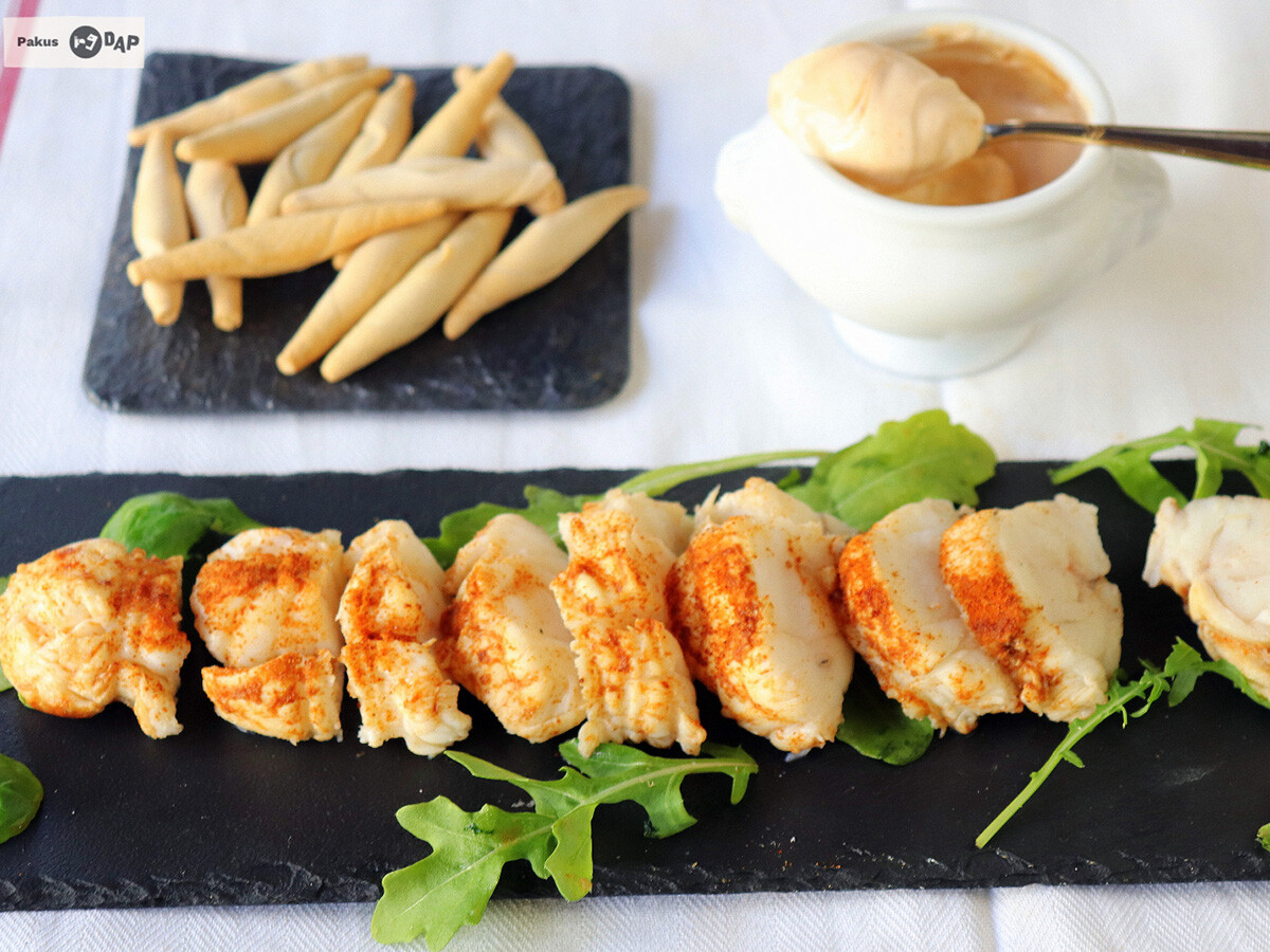 Sazonamos al gusto y espolvoreamos con pimentón de la Vera, solamente la parte superior de la cola del rape. Ponemos al fuego un cazo con agua y un poco de sal y lo llevamos a ebullición. Cocemos el rape durante cinco minutos o seis, según el grosor y lo sacamos y escurrimos bien, dejando que enfríe antes de manipularlo. Hay otras versiones de esta misma receta en las que en lugar de cocer el rape, se dora en la plancha o se cocina en el horno.