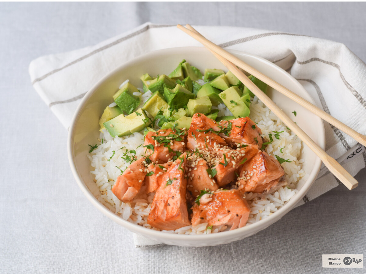 Este salmón es ideal para servirlo con arroz blanco cocido y un poco de aguacate como en nuestro caso. Si lo prefieres, también puedes servirlo con unas verduras al vapor.
