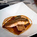 Luego cocinamos el salmón, atemperado, empanada la piel con las semillas de sésamo y marcando en una sartén a fuego medio el salmón por esa parte de la piel en un poco de aceite de sésamo, durante un par de minutos por cada lado.