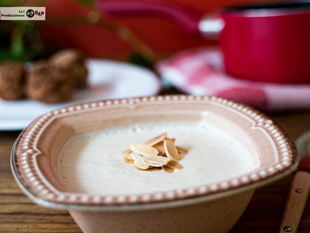 Primero hay que picar cebolla y ajo en juliana y los pochamos sin que cojan color en una cazuela a fuego suave. Añadimos los alcoholes, dejamos que reduzcan y vertemos el caldo de verduras, añadiendo también las almendras y lo cocemos 15 minutos.