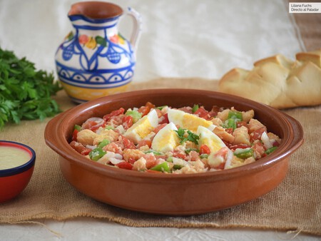 De hecho, un amigo lo definió como un salmorejo sólido. Y no le falta razón, pues lleva pan duro, tomate, pimiento verde, pimiento rojo, un poco de ajo y cebolleta, huevo cocido y sal. Misterio en la compra, ninguno.