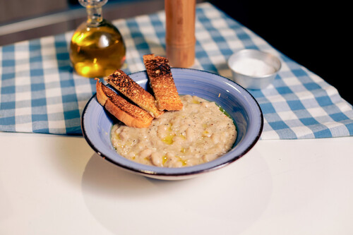 Este plato, claro está, es una versión con legumbres de la clásica pasta cacio e pepe, típica del Lazio y Roma. Los clásicos espaguetis son sustituidos por alubias blancas cocidas, lo que hace que sea más saciante, pero además se convierte en un plato rico en proteínas y bajo en carbohidratos.
